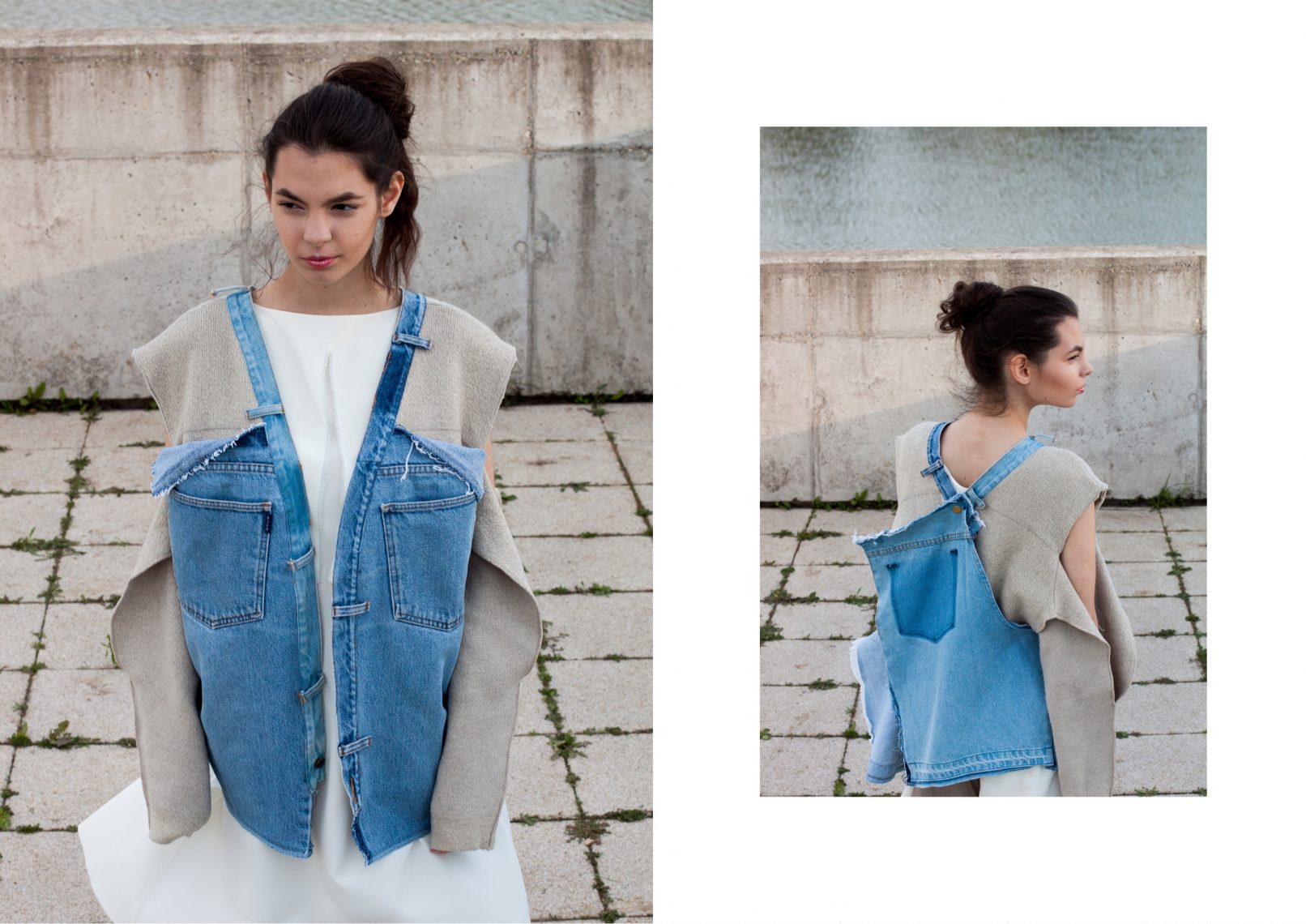 A koncepció a mainsteram basic pulóver-farmer kombináció mint viselet dekonstruálása volt. A két öltözék ellentétes aspektusa mind a formavilágában mind a anyagminőségben megjelenik. Ezeket az attribútumokat bontottam szét, majd pedig építettem újra egy öltözéken belül úgy, hogy ötvöztem a kötött pulóver organikus struktúráját, a farmer statikus szerkezetével.