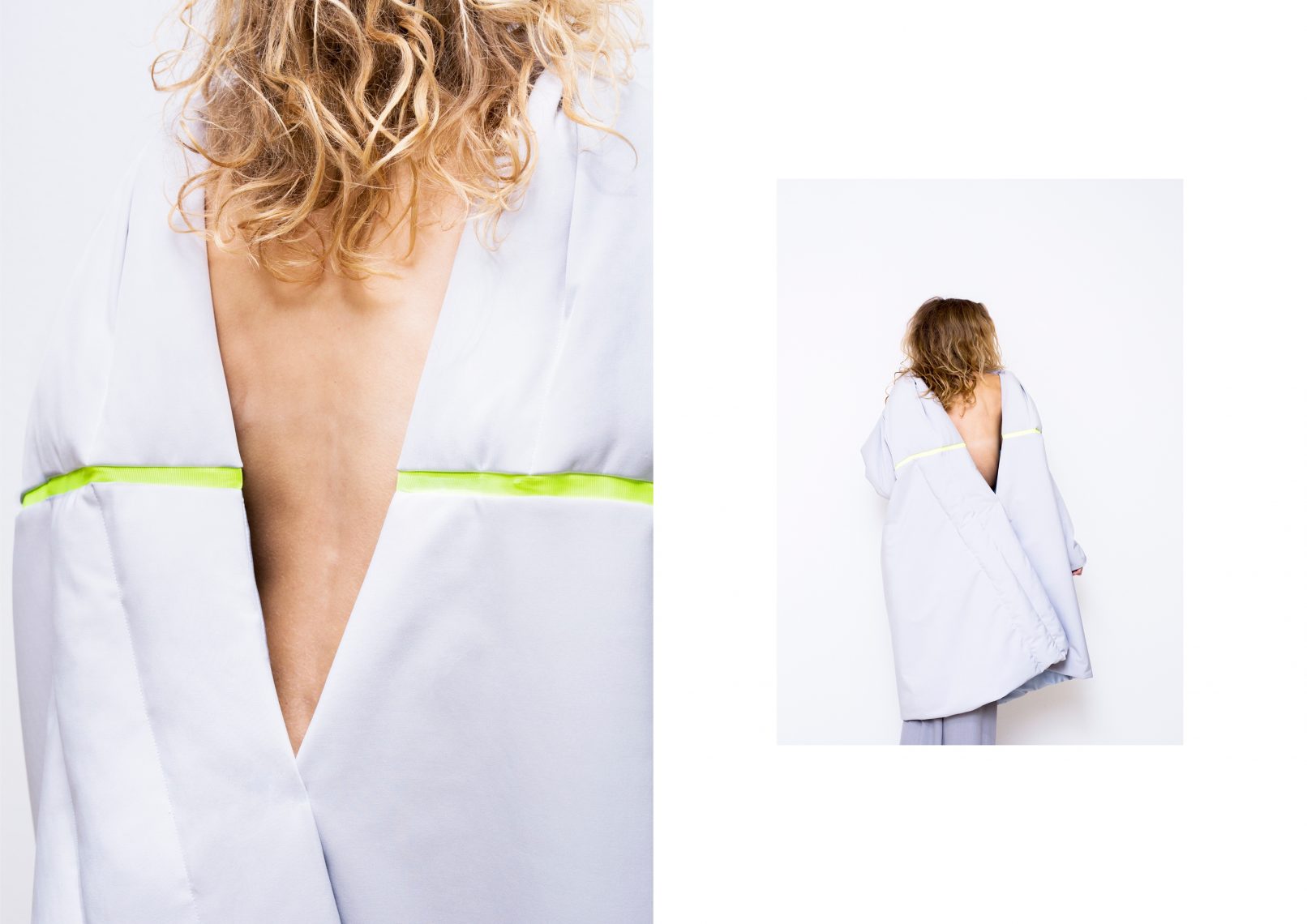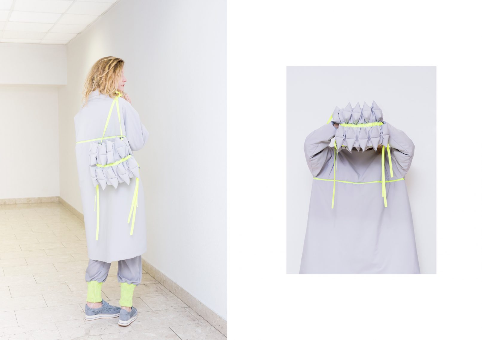 A kollekció tervezésénél a paplan cellás szerkezetének az újrastruktúrálásával kísérleteztem. A kitömött rétegek 3D-ben való kiterjesztése volt a célom annak érdekében, hogy minél inkább növeljem a kabát hőtartó-képességét és, hogy vizsgáljam a halmozott ritmizált felületek formaalakító képességét. Emellett pedig a cellák kapcsolódási pontjait újraértelmeztem, kialakítva új moduláris összeállítási rendszert.