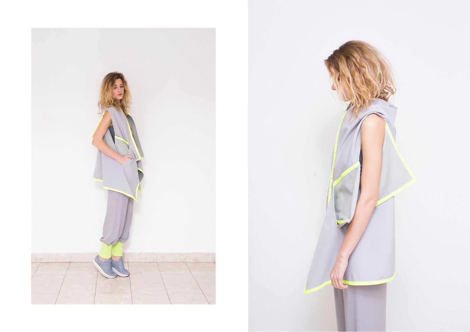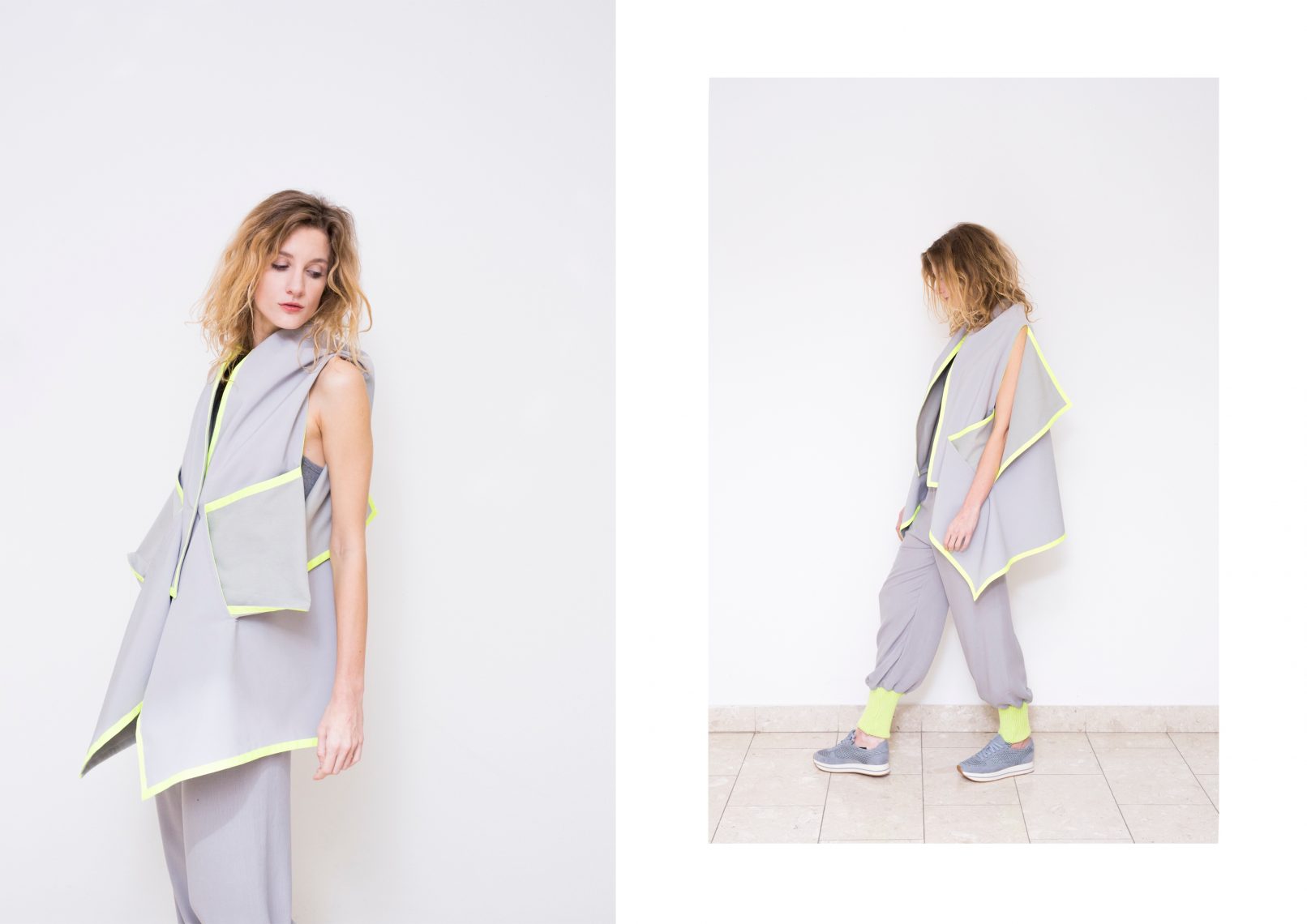 A kollekció inspirációja a zero waste szellemisége volt, hogy úgy használjak fel egy adott matériát, hogy ne keletkezzen utána maradék. Geometrikus vonalvezetés dominált a tervezésemnél, ahol a formaalakítást szimmetrikus ‘L’ alakú bemetszésekkel oldottam meg. Így létrehozzva variálható formavilágot, különböző nyak és karkialakítást, valamint zsebmegoldásokat.
